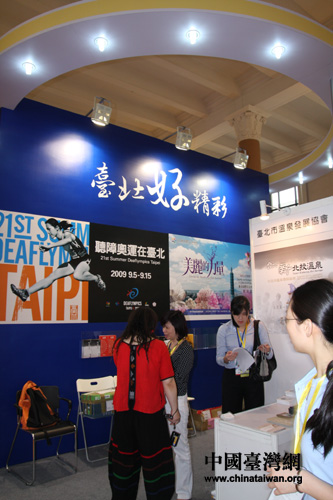 2009北京国际旅游博览会6月18日至20日在北京展览馆举办,“台湾馆”四度参展,并在5号馆“安营扎寨”。强大的阵容、包馆的形式堪称历届之最:除了台北县、台北市、苗栗县、南投县、高雄市等县市观光部门,台湾各地旅游景区、合格接待社、高级渡假村及酒店、主题乐园、美食餐饮、观光购物商店等在内的33家参展商汇聚于此,在大陆居民赴台游开放即将一周年之际,为参观者呈现了一套丰盛的台湾旅游大餐。