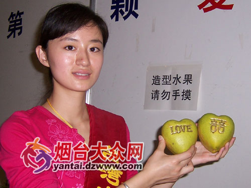 在台湾中农集团展台前,两个“爱心”柚子吸引了参观者,记者看到,这两个柚子有巴掌大小,金黄色,上面还分别有双喜和英文“LOVE”等文字。集团负责人简杨柳先生告诉记者,这样的柚子目前售价50元一个,而柚子呈现特殊的形状得益于一种特殊的模子,从柚子很小时就套上这种模子,直到长大就可以得到想要的形状了;由于这种种植方式是刚刚研究成功的,而这两个柚子更是一星期前摘下,专为参加果蔬会从台湾空运来的,所以此次亮相果蔬会还是“爱心”柚子首次与大家见面呢。