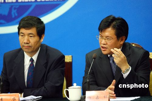 五月三十一日,国务院台湾事务办公室在北京国台办新闻发布厅举行例行新闻发布会,作为大陆地区最大的农民合作经济组织,供销总社办公厅副主任杨占科(右)在谈及“适时组织由有实力的农产品供销企业和行业组织组成的台湾农产品采购团,赴台采购”的问题时指出:组织采购团的工作已全面展开,并与台湾方面进行了初步沟通、协商,力争早日成行,以达到帮助台湾农民解决农产品丰产滞销的问题,同时也为大陆消费者提供来自台湾的新品种、高质量的农副产品,实现互利双赢之目的。中新社发 盛佳鹏摄