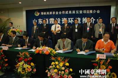 在今天海峡两岸农业合作成果展览暨推介会开幕式之后,签约仪式会场传来了捷报。由山东省栖霞市招商引资促进局和大中华国际投资管理集团(控股)有限公司就成立山东百佳(暂定)国际农产品交易物流中心达成协议,今天早上9:50双方正式签约。该项目主要包括农产品物流项目、中华农学村项目、桔杆发电项目、香草种植加工业务四项。其中,农产品交易中心项目总投资约2.8亿美元,项目公司注册资金5000万美金。(谢晓萍 云鹏/图)