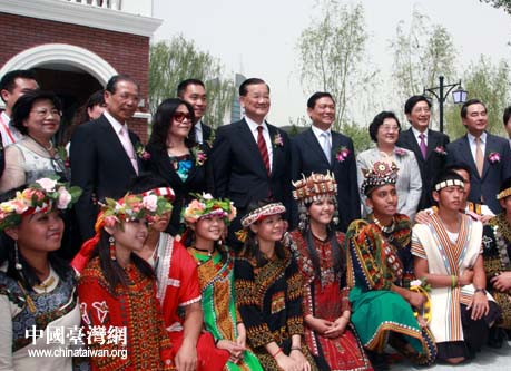 中国国民党荣誉主席连战,中共中央政治局委员、中共北京市委书记刘淇,全国政协副主席、台盟中央主席林文漪,中共中央台办、国务院台办主任王毅等在五桂楼前合影留念。(中国台湾网 董洁 摄)