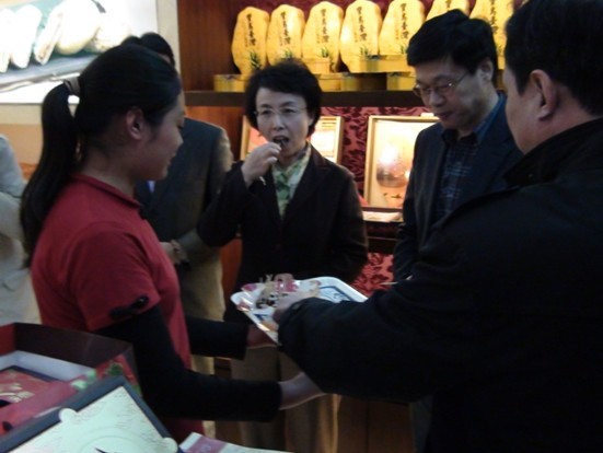 北京市副市长陈红正在品尝销售人员准备的百年老字号的凤梨酥。