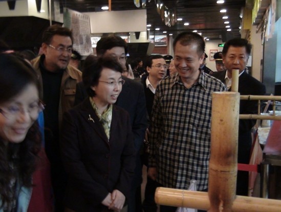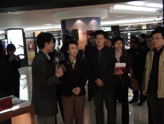 台湾百大馆工作人员正在认真的给北京市副市长陈红介绍本馆的相关情况,北京副市长陈红耐心的聆听。