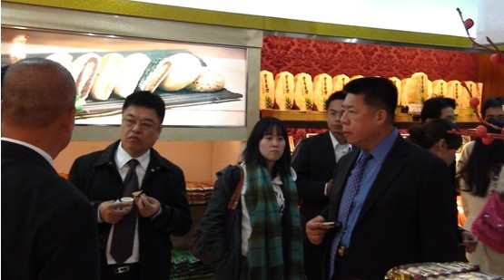 中华两岸企业发展协进会理事长张晁祥先生,细心的聆听工作人员讲述宜蘭饼的介绍。 据工作人员介绍,“宜蘭饼”是全世界最薄的饼只有0.1公分,轻薄如纸,可透光,香脆可口,吃后令人爱不释手。