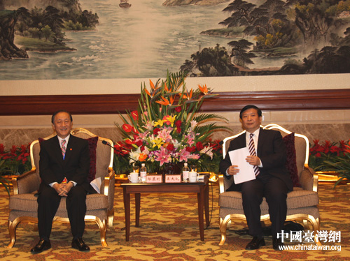 山东省委副书记、省长姜大明与台湾新党主席郁慕明座谈。(摄影:董洁)