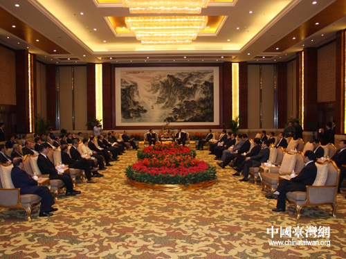 中国台湾网9月25日潍坊消息 25日下午,山东省委副书记、省长姜大明在潍坊会见了前来参加“第十四届鲁台经贸洽谈会”的台湾新党主席郁慕明、台湾商业总会理事长张平沼等台湾知名人士和台商代表。