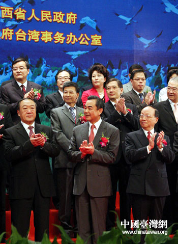 9月21上午,由国务院台办和江西省政府共同主办的“2009赣台经贸合作研讨会”在南昌开幕,千余台商与会。中共江西省委书记、省人大常委会主任苏荣(左),中共中央台办、国务院台办主任王毅(中),中国国民党副主席蒋孝严(右)共同出席开幕式。(中国台湾网 钟宝华 摄)