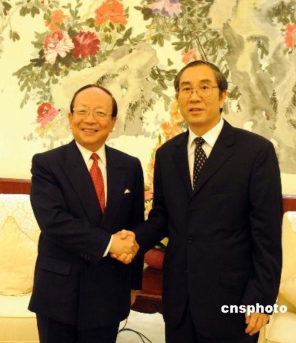 4月18日晚,广西壮族自治区主席马飚(右)在南宁接见了到访的中国国民党副主席蒋孝严。蒋孝严将于4月20日赴广西桂林祭祀母亲,马飚在会见中透露,广西将组团于5月下旬赴台举办经贸交流会,届时将组织上规模的采购团赴台采购,采购金额达一亿六千万美元。 中新社发 蒋雪林 摄