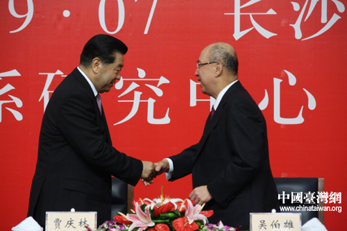 中共中央政治局常委、全国政协主席贾庆林与中国国民党主席吴伯雄出席。中国台湾网 钟宝华 摄