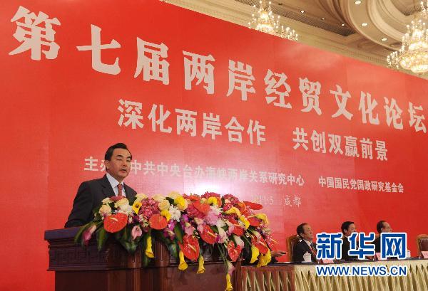 5月8日,第七届两岸经贸文化论坛在四川成都闭幕。中共中央政治局常委、全国政协主席贾庆林和中国国民党荣誉主席吴伯雄出席闭幕会。这是中共中央台湾工作办公室主任王毅进行论坛小结。新华社记者 饶爱民 摄