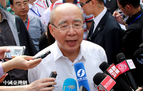 图为吴伯雄在映秀镇接受媒体采访。(中国台湾网 高斯斯 摄)