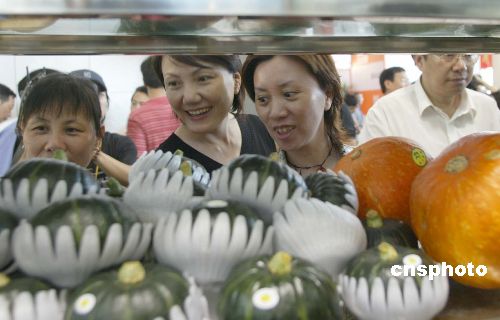 五月十八日,来自台湾的新鲜蔬菜在福州市举办的第七届海峡两岸经贸交易会上展出,引来大批参观者的关注。作者:史利
