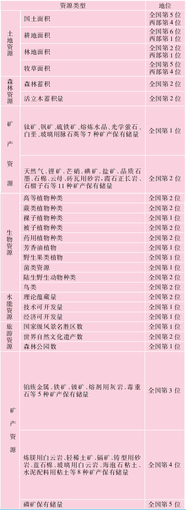 四川省矿产资源丰富且种类比较齐全,能源、黑色、有色、稀有、贵金属、化工、建材等矿产均有分布。已发现各种金属、非金属矿产132种,占全国总数的70%;已探明一定储量的有94种,占全国总数的60%,分布在全省大部分地区。有32种矿产保有储量居全国前5位,其中钛矿、钒矿、硫铁矿等7种矿产居全国第一位。钒、钛具有世界意义,钛储量占世界总储量的82%,钒储量占世界总储量的1/3;天然气、锂矿、芒硝等11种矿产居全国第二位;铂族金属、铁矿等5种居全国第三位;炼镁用白云岩、轻稀土矿等8种矿产居全国第四位;磷矿居全国第五位。