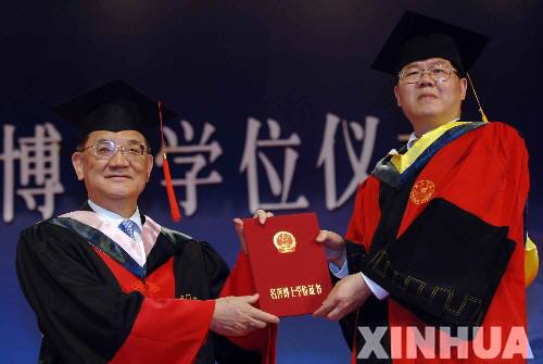 4月19日,中国国民党荣誉主席连战接受法学名誉博士学位证书。新华社记者 王建华 摄
