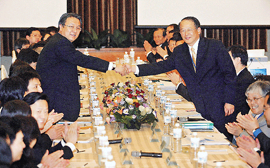 两岸第二次ECFA协商上午在鸿禧大溪别馆举行,台方主谈人“国贸局长”黄志鹏(右)与大陆主谈人商务部台港澳司司长唐炜(左)在会谈开始前按例先礼后兵,握手拍照。 联合晚报图