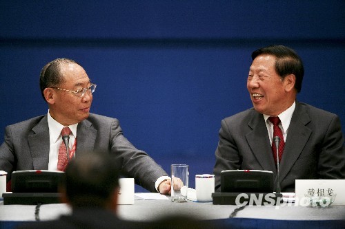 4月11日,博鳌亚洲论坛举行“两岸企业家圆桌会议:两岸签订ECFA后的商机”分论坛。全国社会保障基金理事会理事长戴相龙(右)与两岸共同市场基金会最高顾问钱复(左)共同主持会议。 中新社发 陆欣 摄