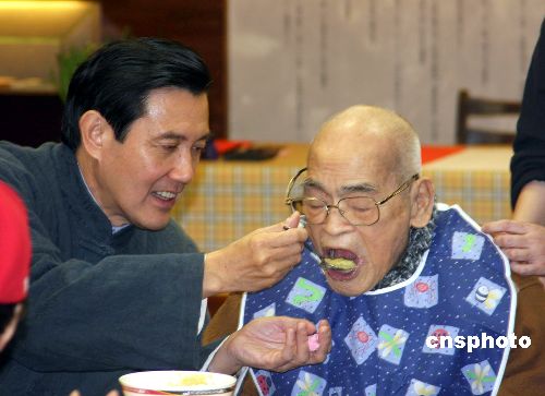 二月六日农历除夕,国民党的台湾领导人候选人马英九来到已有八十五年历史、收容老残无靠老人的“台北市私立爱爱院”,亲自为孤寡老人喂饭。 中新社发 耿军 摄
