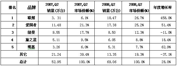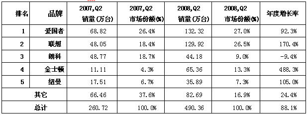2008年Q2,爱国者依然占据市场第一的宝座,销售量为132.32万台,占据27.0%的市场份额;而联想不甘落后,通过推出联想福娃、奥运火炬等闪存盘,跳脱出传统的降价促销,大手笔地拉开奥运促销大幕,占据26.5%的市场份额,二者差距越来越小。