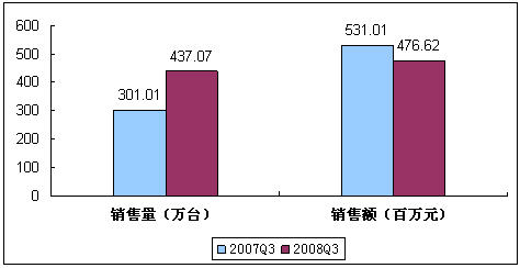 赛迪顾问市场监测数据显示,与去年同期相比,2008年第三季度中国闪存盘市场销量表现为一定的上扬趋势,销售闪存盘437.07万台,同比增长45.2%;实现销售额4.77亿元,同比下降10.2%。这是由于自2008年7月初开始,以一直处于高端价位的Sandisk为急先锋,其产品价格的大幅下调引发了其他品牌厂商纷纷跟随降价,这挤占了闪存盘的利润空间。