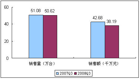 赛迪顾问市场监测数据显示,2008年第三季度中国移动硬盘市场表现不尽人意,量额齐跌,实现总销量50.62万台,与2007年同期相比下降0.9%;实现销售额3.82亿元,同比下降10.5%。