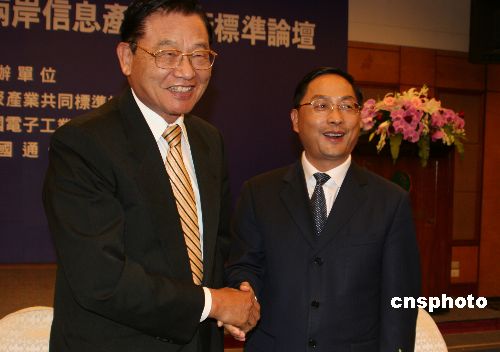 | 5月11日,第二届“海峡两岸信息产业技术标准论坛”在台北落幕,取得五项进展。图为华聚产业共同标准推动基金会董事长江丙坤(左),与来自大陆的信息产业部副部长蒋耀平握手致意。 |