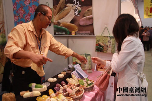 台湾苗栗县一家厂商生产的丝瓜络美容香皂受到了女孩子的热烈欢迎。(中国台湾网 肖燕摄)