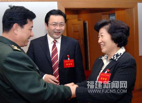 12月25日,履新近一个月的中共福建省委书记孙春兰(右)出席福建省经济工作会议与参会代表握手交谈。当日,福建省经济工作会议在福州召开,中共福建省委书记孙春兰在会上作讲话时指出:福建要发挥“五缘”优势,积极承接台湾产业转移。(记者 刘可耕 摄)