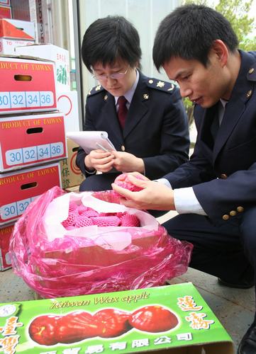 23日上午,今年首批台湾水果运抵厦门,经厦门市检验检疫局检验完后正式投入市场。据悉,此次抵达厦门的台湾水果有9个品种,包括鲜菠萝、鲜枣、柑等水果,共6220千克。 吴晓平 摄影报道 来源:台海网