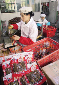 四月二十三日,在沙县富口鸿光食品厂包装车间,工人们正在封装刚出炉的豆干。这家企业依托沙县小吃的影响和带动,采用传统独特工艺辅以现代科 技,年产近千吨的“老情人”系列豆干,成功挺进十多个省份的各大超市。据悉,沙县小吃业蓬勃发展,有力拉动土特产业的兴盛,目前全县已发展土特产生产企业四十多家,其产品随小吃从业大军销往全国各地。(三明日报 罗邦铭 管柳英)