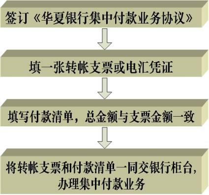 集中付款业务是指付款人在需要向多个收款人支付货款时,依据与我行签订的《华夏银行集中付款业务合作协议》,向我行提交一张支票(或电汇凭证)和与汇款内容对应的支付清单,同时完成向多个收款人支付款项的结算业务。付款人也可以使用"华夏互连通"集中付款软件录入支付信息,通过华夏银行网上企业银行一次性向多家收款人进行支付。