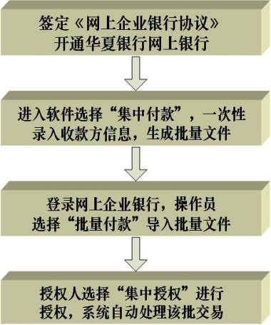 2.付款当日,客户进入"华夏互连通"集中支付软件选择"集中支付",一次性录入收款方信息,生成批量文件;