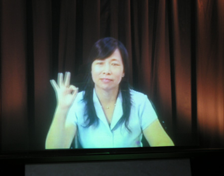 该公司展示的这套三维立体真人显像系统, 可以创造三维立体真人大小的实体影像, 让两个处在不同地点的人相互沟通时, 可以有近在咫尺般的真实感受, 眼神跟眼神的交会, 实时的互动响应, 给人以身临其境的感觉。 据该公司负责人黎逸凡先生介绍,这项技术结合了网络技术和光学技术, 将真人影像透过摄像头撷取后, 经过转换, 将影像讯号转成数字讯号, 再透过网络传输, 将数字讯号转回成影像讯息, 投影在一片能产生三维效果的光化玻璃板上, 让远方的影像看起来就像真人三维影像实时呈现一样, 有非常真实的立体感受, 让我们几乎察觉不到对方是在遥远的另一方。它能够完美地解决远距离沟通的问题,适用于远程会议、远距采访、 甚至最先进的远程教学。例如,一位学者在北京发言, 应用这套系统,就能在同一时间, 将他的三维立体影象显现在上海、广州或世界上任何一个地方的讲台上, 并能让讲演者像亲临现场一样, 与台下的观众作实时的互动,打破了人与人的界限藩篱。 黎先生介绍,公司目前正与奥组委相关人员从三方面推介该项目:一,应用于会议中心,如国际奥委会、中国奥委会开会等,能够借助此系统随时沟通;二,赛事进行时,可以借助此系统采访不同国家的专业运动员,或请资深人员进行评论等;三,出于安全考虑,国家领导人不便亲身出席时,可以借助此套系统随时现身。