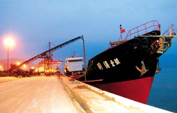马祖乡亲盼望已久的“两马”货物直航今日正式启动。福州马尾华荣海运有限公司的“明德壹号”货轮(图为正在连夜装砂的货轮),定于今日上午9时30分运载1000吨河砂从马尾青洲港区首航马祖。这是“两马协议”签订后,“两马”之间实现人员双向直接往来后的又一重大突破,也是对“两马协议”的具体落实。此次首航后,近期每月将有10船左右的砂石运往马祖。