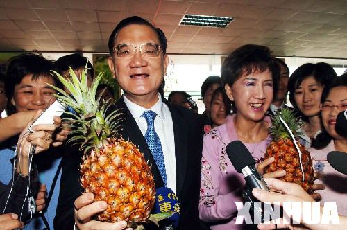 4月20日,中国国民党荣誉主席连战参观厦门台湾水果销售集散中心。连战夫妇称赞台湾水果好吃,为台湾水果做起“广告”。新华社记者 王建华 摄
