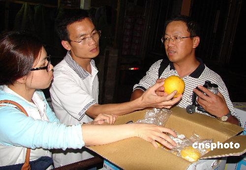 6月6日晚,第一批从台湾运来泉州参展的30吨水果抵达泉州,共有台湾凤梨、杨桃、芒果、木瓜、哈密瓜、葡萄柚等10种时鲜水果。届时这些水果将运往南安石井闽台农产品市场,参加8日至12日举行的第三届海峡两岸(泉州)农业合作交流洽谈会暨首届海峡两岸(泉州)农产品展洽会。图为台湾参展商在检查刚运抵的葡萄柚。 中新社发 傅丹丹 摄