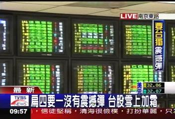 中新网3月5日电 陈水扁4日晚丢出“四要一没有”的“台独”言论,再度给台股投下震撼弹。据台湾TVBS报道,原本就雪上加霜的台股在连跌两天之后,今天(5日)一开盘又下跌89点。