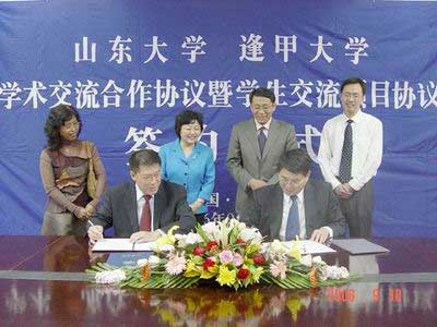 华夏经纬网9月13日讯:9月10日下午,在山东大学邵馆第一会议室,山东大学与逢甲大学学术交流合作协议暨学生交流项目协议签约仪式举行。山东大学校长展涛和逢甲大学校长刘安之分别代表各自学校在协议书上签字。这是继2005年与东吴大学签署全面学术交流协议以来,山东大学与第三个台湾高校签署全面交流协议。
