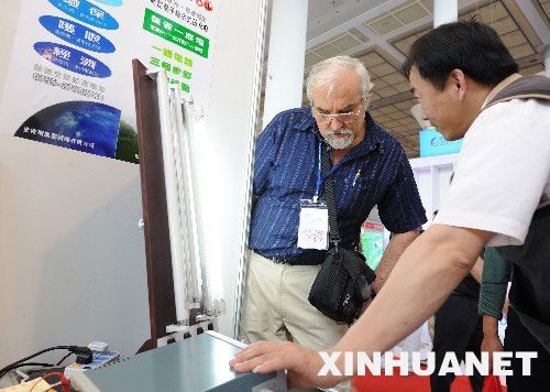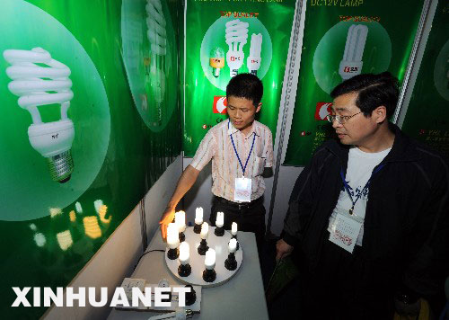 4月8日,一位澳大利亚客商(左)对台交会上展出的节能灯产品产生浓厚兴趣。 当日,第十二届台交会在厦门国际会展中心举行,两岸参展企业展出的节能照明、太阳能应用等产品不仅增添了本届台交会节能环保的特色,同时受到广大客商的青睐。 新华社记者姜克红摄