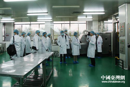 两岸记者参观台资企业元祖食品生产区。(中国台湾网 马迪 摄)