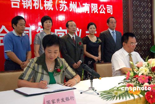 资料图片:9月28日,国家开发银行与台钢机械(苏州)有限公司(前右)贷款合同正式签署。台钢机械是获得国家开发银行首笔贷款的苏州首家台资中小企业。国家开发银行还将在未来5年内向台资企业提供300亿元的贷款,积极解决台资企业特别是中小台商的融资难题,共同促进海峡两岸经贸交流的发展,造福两岸同胞,发展两岸关系。 中新社 邱勇 摄