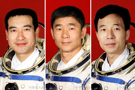 中国“神舟七号”航天员乘组24日下午在酒泉卫星中心与媒体见面。翟志刚、刘伯明、景海鹏(从左至右)组成飞行乘组执行“神舟七号”载人航天飞行任务。(图据中国载人航天工程网)