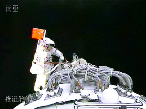 翟志刚对着摄像机挥舞国旗。