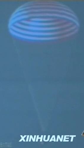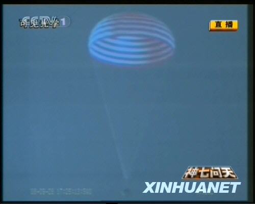 9月28日,神七返回舱主降落伞打开。 新华社发(电视截图)