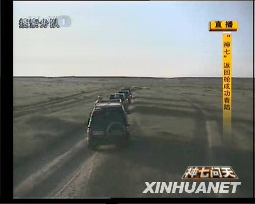 9月28日,神七返回舱成功着陆。这是搜救车队正赶往着陆场。新华社发(电视截图)