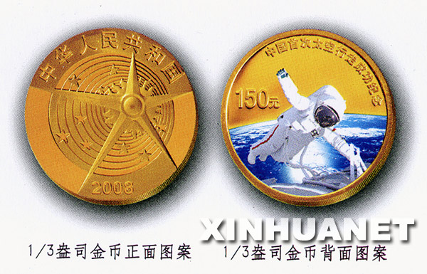 10月8日,中国人民银行发行中国首次太空行走成功金银纪念币一套。该套金银纪念币共2枚,其中1/3盎司金币1枚、1盎司银币1枚,均为中华人民共和国法定货币。这是1/3盎司金币正反面图案。新华社发