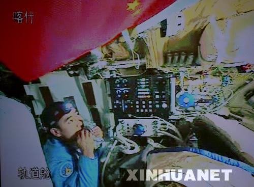 从北京航天飞行控制中心接收到的飞船舱内实时画面上,新华社记者感受着航天员翟志刚、刘伯明、景海鹏的太空生活。