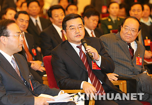 10月16日,中共十七大代表、国防科工委主任张庆伟说,举世瞩目的绕月工程总体准备情况良好,正在进行10月下旬首飞发射前的各项准备工作。这是张庆伟(前中)就绕月工程回答记者提问。 新华社记者 黄敬文 摄