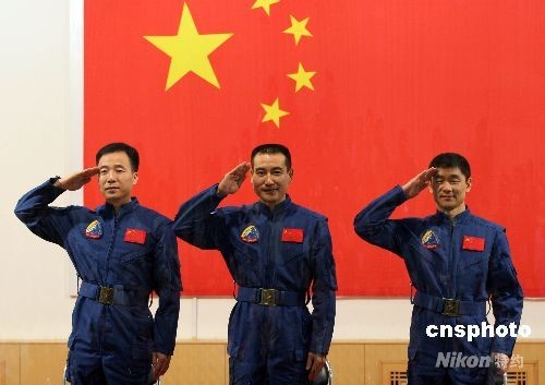 9月24日下午,神舟七号航天员与记者见面会在酒泉卫星发射中心举行,航天员翟志刚(中)、刘伯明(右)、景海鹏组成飞行乘组,执行“神舟七号”载人航天飞行任务。中新社发孙自法 摄