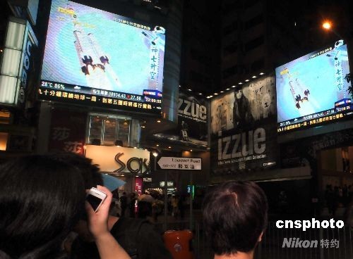 9月25日晚,中国载人太空船“神舟七号”在中国酒泉卫星发射中心顺利升空。图为“神舟七号”升空相关新闻片段在香港铜锣湾闹市播放,吸引市民驻足观看。 中新社发 邓庆乐 摄