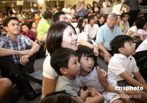 9月25日晚,香港市民在太空馆观看“神舟七号”升空直播。 中新社发 张勤 摄